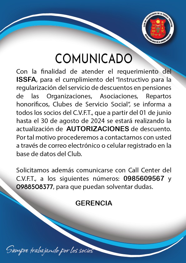 Club de Voluntarios de la Fuerza Terrestre «Cabo Nicanor Quiroz Salazar» Gerencia informa a todos los socios que desde el 01 de junio hasta el 30 de agosto de 2024 se actualizarán las autorizaciones de descuento.